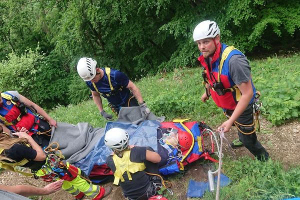 Zwei verletzte Kletterer wurden von unseren Notärztinnen und Bergrettern versorgt und mit der Gebirgstrage nach oben abtransportiert. Eine gelungene Übung bei perfektem Wetter.